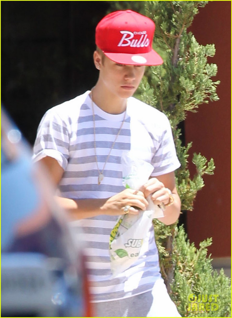 Justin Bieber keeps a low profile under his Chicago Bulls cap as he stops into a local Subway restaurant on Sunday (July 1) in Calabasas, Calif.