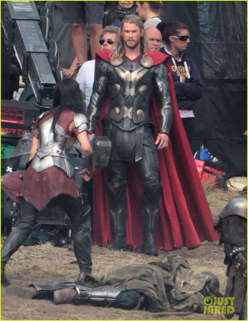 The 29-year-old actor was joined on set by his co-star Jaimie Alexander, who plays Sif, a second generation warrior goddess of Asgard.