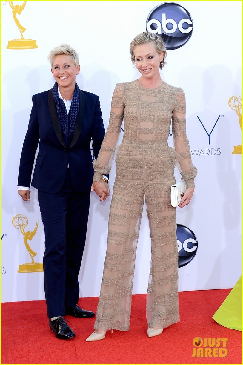 Ellen DeGeneres holds hands with her wife Portia de Rossi at the 2012 Emmy Awards held at the Nokia Theatre L.A. Live on Sunday (September 23) in Los Angeles.