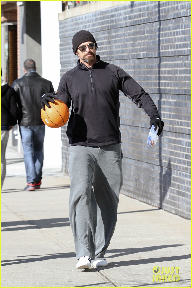 Hugh Jackman dribbles a basketball while out with his two kids Oscar and Ava on Saturday (March 9) in New York City.