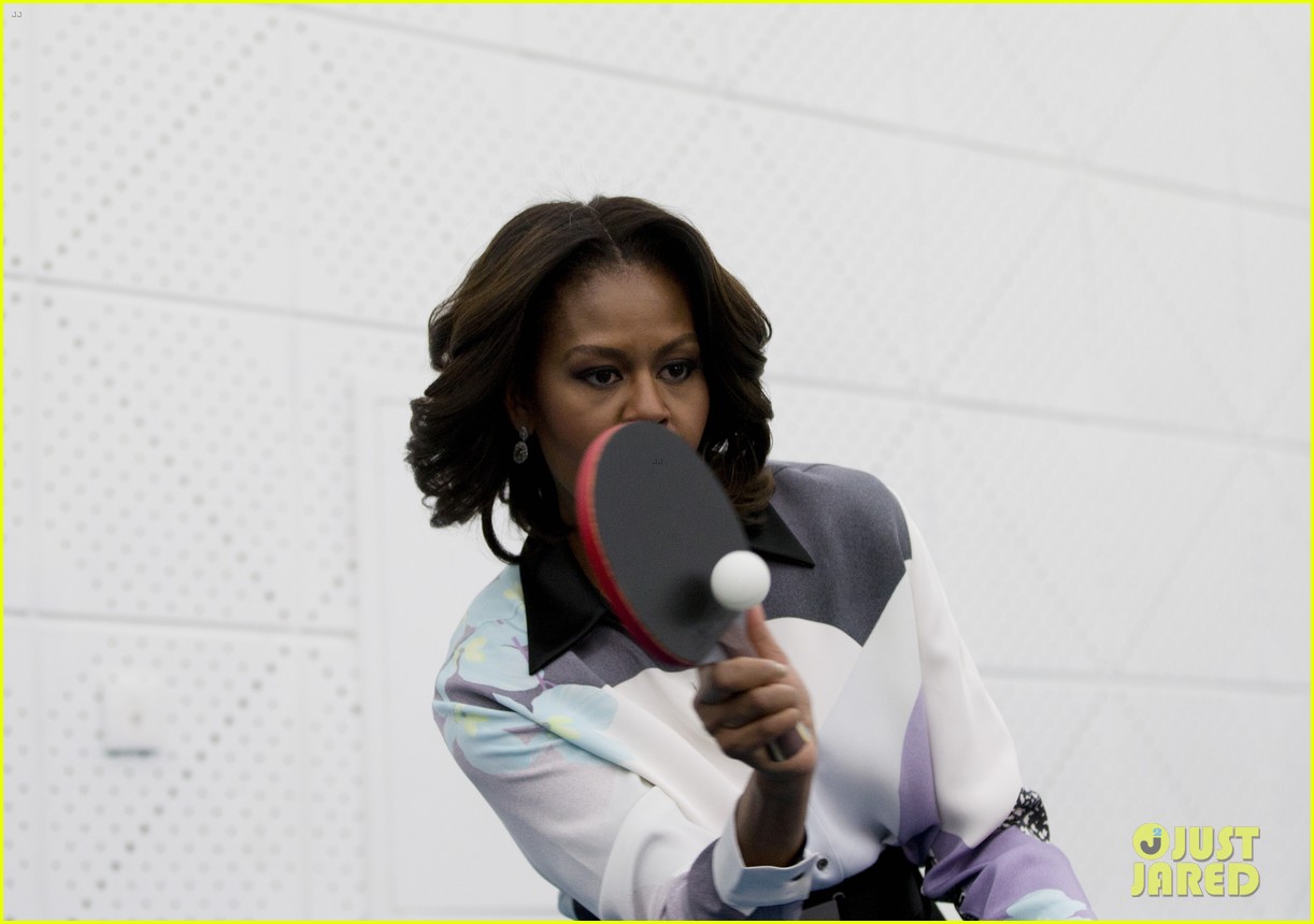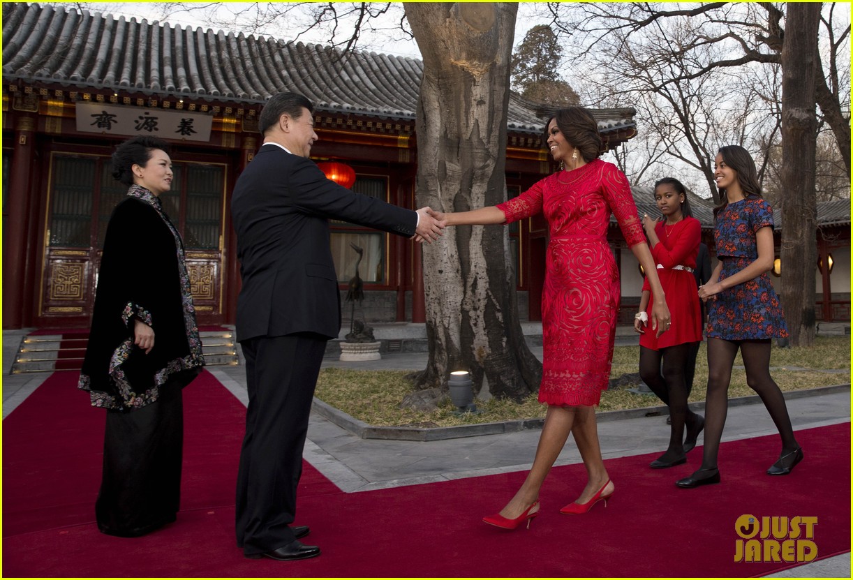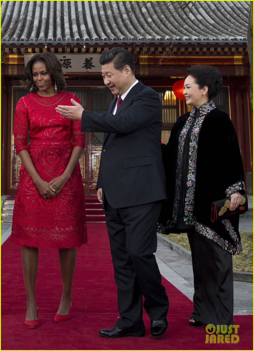 Michelle looked ravishing in red on Friday while meeting with Chinese President Xi Jinping and his wife Peng Liyuan at the Diaoyutai State guest house. She also visited the Beijing Normal School to check out the technology and play some ping pong with students that day.
