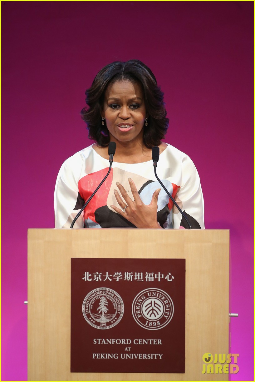 Michelle Obama wears a Carolina Herrera dress with a splash of color while deliver a speech at the Stanford Center at Peking University on Saturday (March 22) in Beijing, China.