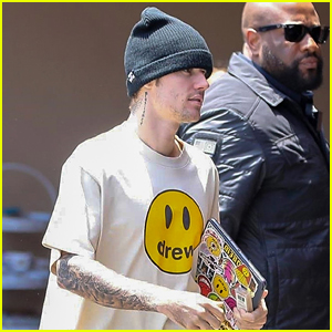 The 25-year-old musician, who wore almost head-to-toe pieces from his Drew clothing collection, held on to his sticker covered tablet, after his recording session.