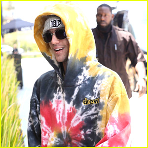 Justin Bieber covered up with a bright red and yellow tie-dye hoodie from his clothing line while out in Los Angeles on Thursday afternoon (June 4).