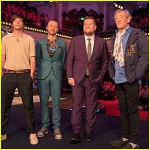 Louis Tomlinson stands beside Sir Ian McKellen and Simon Pegg during their appearance on The Late Late Show with James Corden last night (June 19).