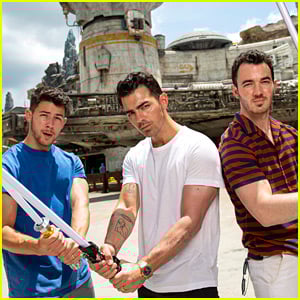 The Jonas Brothers wield their lightsabers while posing for a photo at the new Star Wars: Galaxy’s Edge land at Disney World on Thursday (August 8) in Lake Buena Vista, Fla.