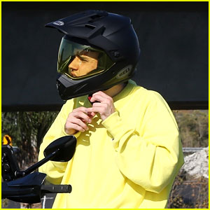 Justin stood out in a yellow sweatshirt that matched his bike, which was customized with his Drew House logos.