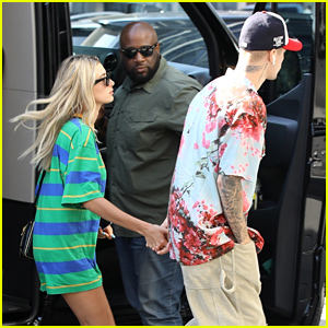 Justin Bieber holds hands with wife Hailey as they arrive for a church service in Beverly Hills, Calif., on Wednesday night (August 7).