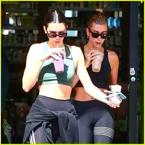 Kendall Jenner and Hailey Bieber take sips of their smoothies while fueling up after a morning pilates class on Monday (August 19) in Los Angeles.