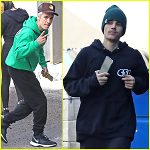 Justin Bieber wears black sweats and a green beanie while heading into a dance studio on Friday morning (January 10) in West Hollywood, Calif.