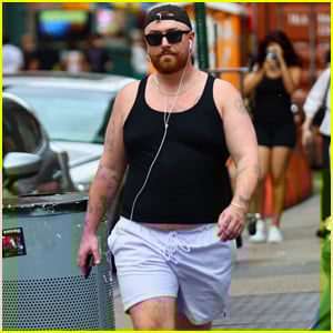 For their outing, Sam sported a black tank shirt, purple shorts, black loafers, and a black baseball hat.
