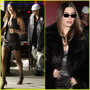 For the party, Hailey rocked a brown leather minidress with a low scoop neckline and 3D scalloped detailing while the 30-year-old “Peaches” singer sported a vintage basketball jersey, cargo pants, and a black leather jacket paired with shades and a beanie.
